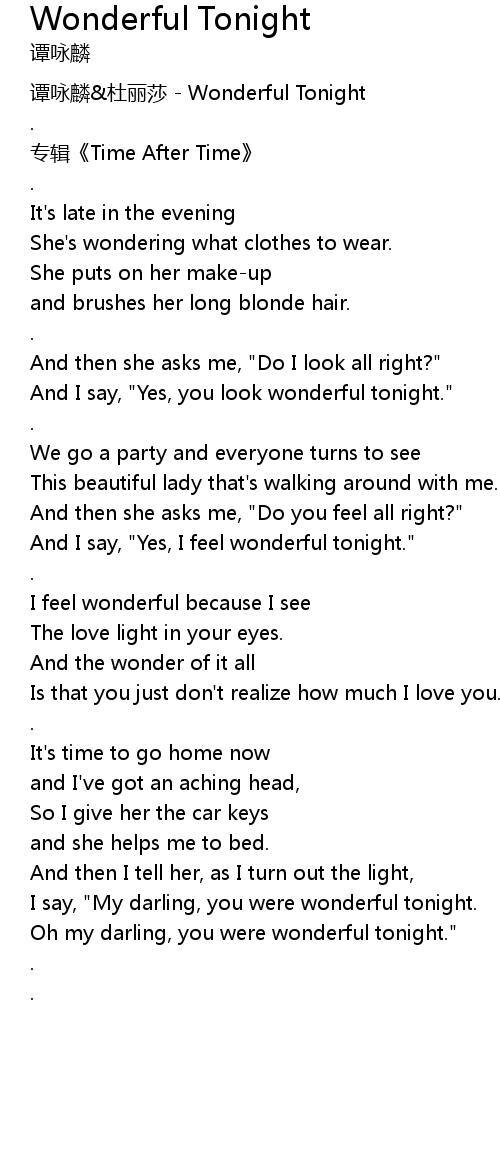 , Judul Lagu : Wonderful Tonight Artist : Eric Clapton. Punya saran/ide untuk lagu lainnya,komentar di bawah. Lyric - Wonderful . "Wonderful Tonight (With lyrics) By Eric Clapton", . If you're searching for Wonderful Tonight Lyrics subject, Wonderful Tonight Lyrics, I do not own this song. Follow me on twitter pls thank you :) - https://twitter.com/Charles8Two.. you have visit the ideal website. Our site always gives you hints for seeing the highest quality pix content, please kindly hunt and locate more enlightening articles and pic that fit your interests.
